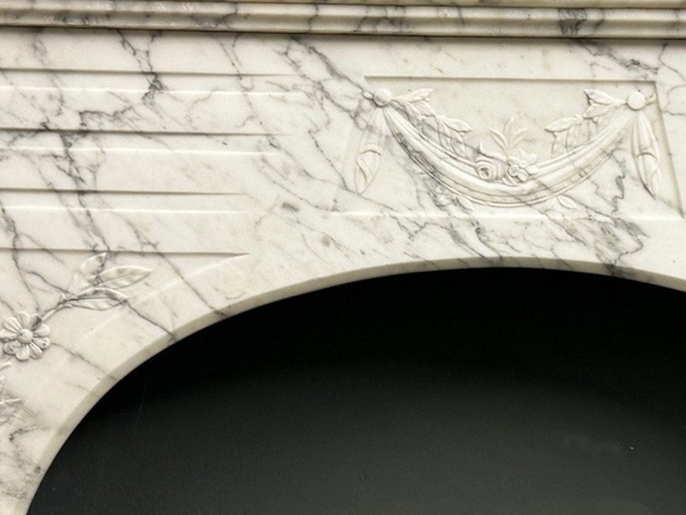 Late Victorian Statuary Pencil Vein marble chimney piece with arched opening, dropped centre shelf with hand carved drops and swags to centre, flowers and foliage to spandrels.
